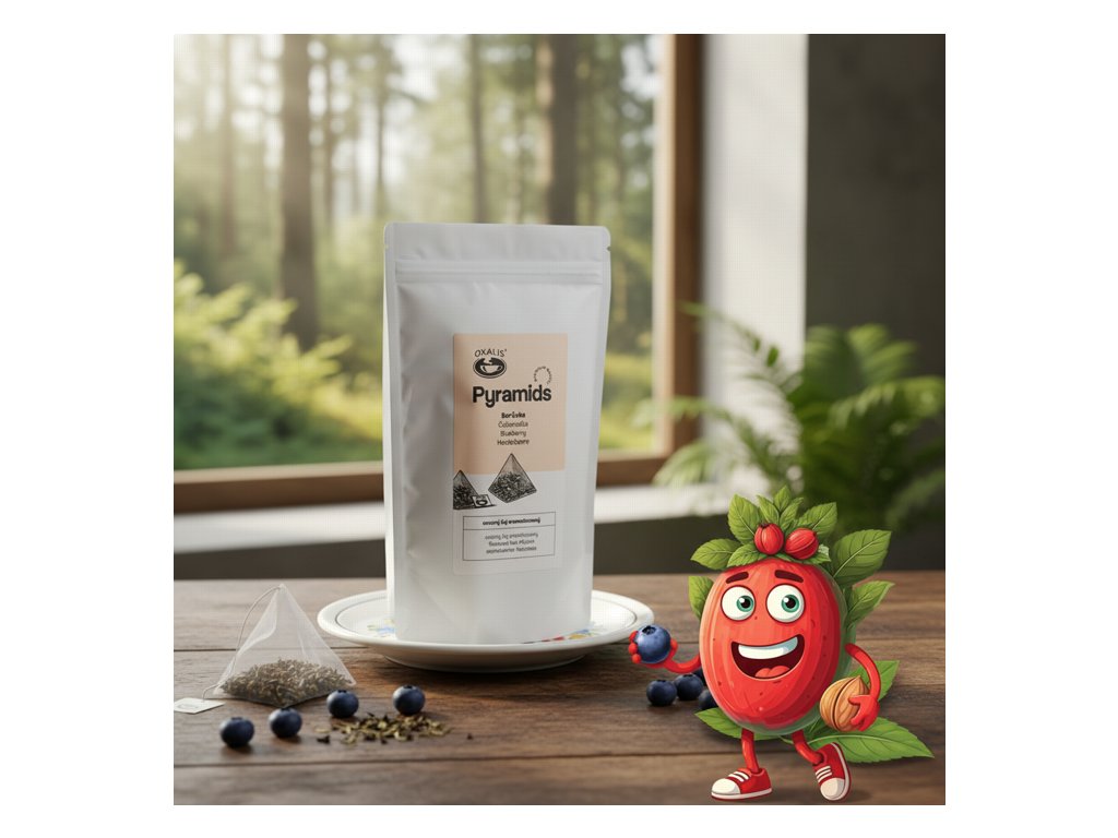 Ovocný čaj s ibiškem s lahodnou chutí zralých borůvek. 20 nálevových sáčků pyramidového tvaru, 1 ks 80 g.