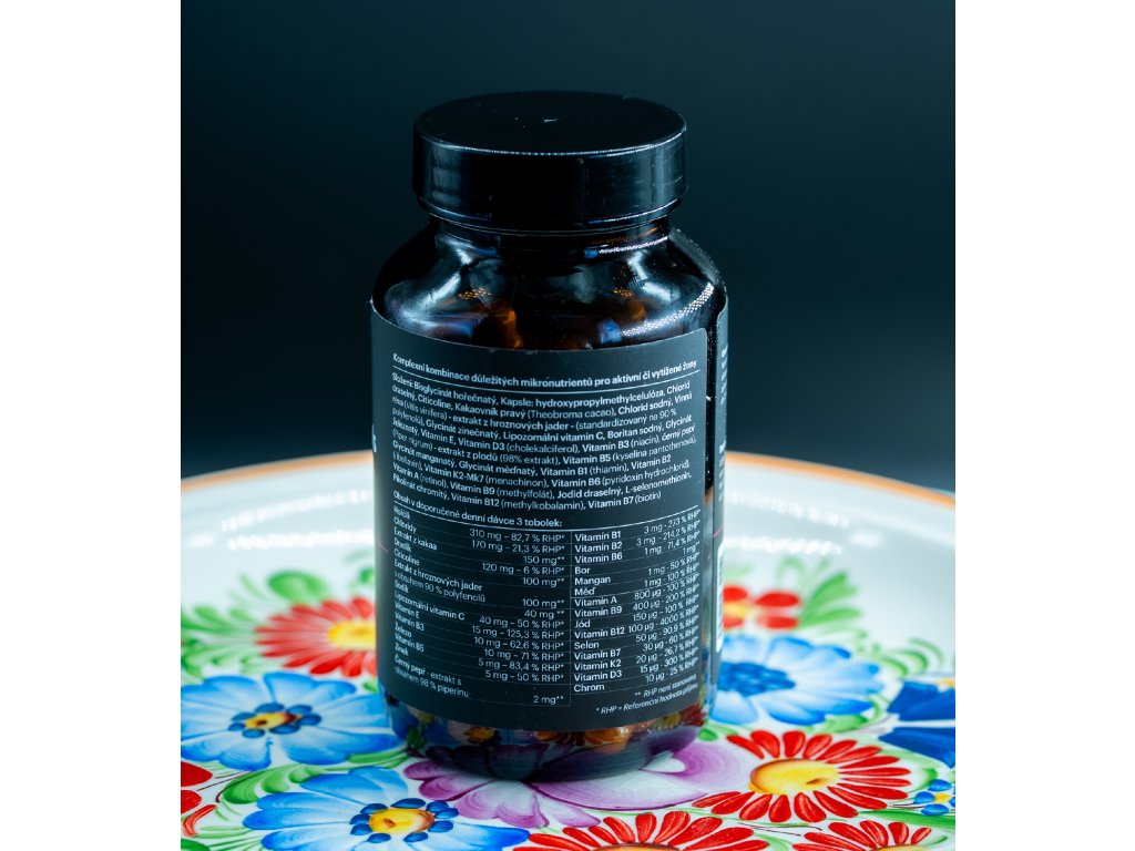Perfektní kombinace 24 látek ve třech tobolkách vám zajistí denní dávku esenciálních vitamínů a minerálů, které dovolí tělu fungovat efektivně a na svém optimu.
