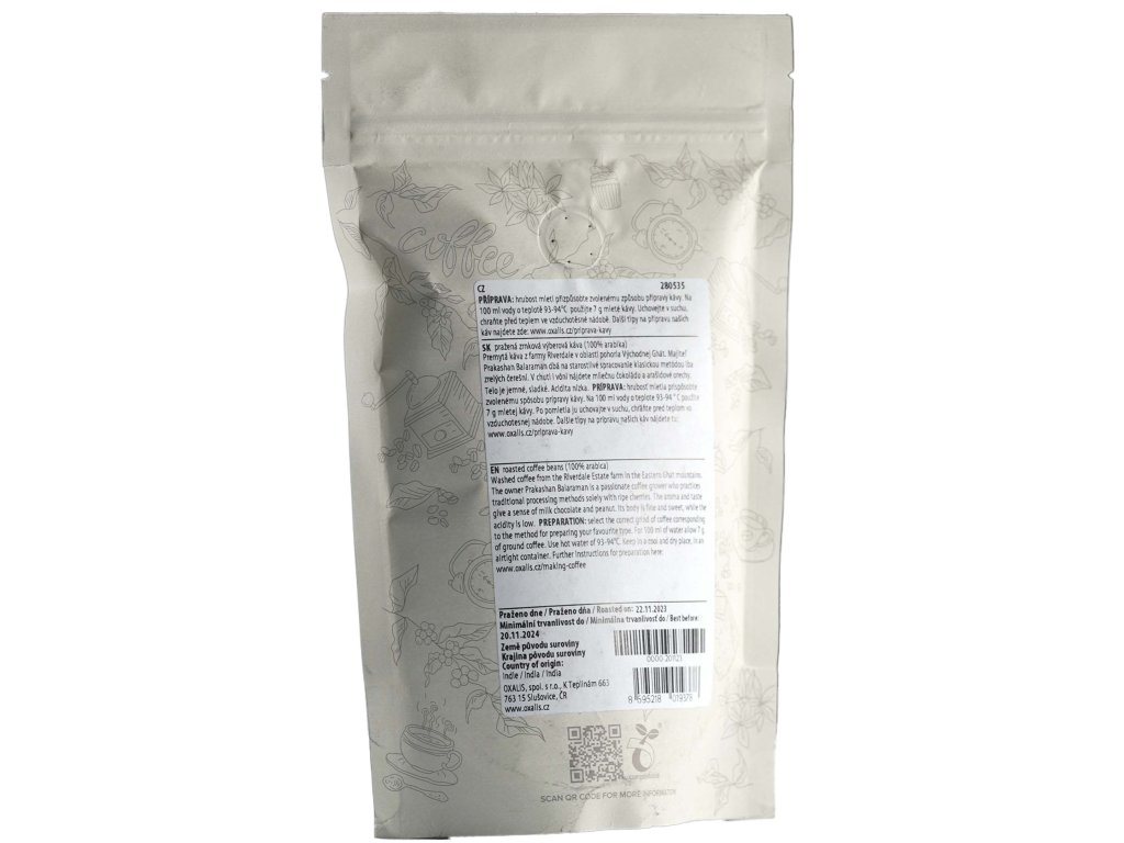 Promytá káva z farmy Riverdale v oblasti pohoří Východní Ghát. Majitel Prakashan Balaraman dbá na pečlivé zpracování klasickou metodou pouze zralých třešní.