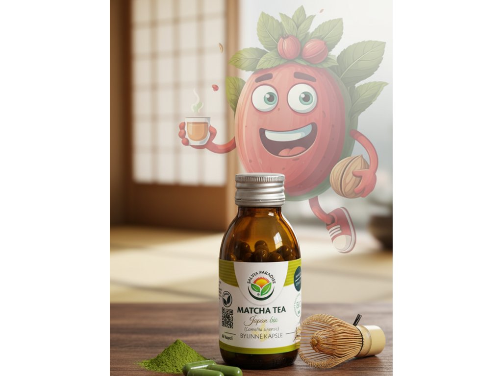 Složení: 100% Camellia sinensis – Matcha BIO, 300 mg/tobolka, obal kapsle: HPMC (hypromelosa). Kapsle jsou rostlinného původu a jsou vhodné i pro vegetariány či vegany.