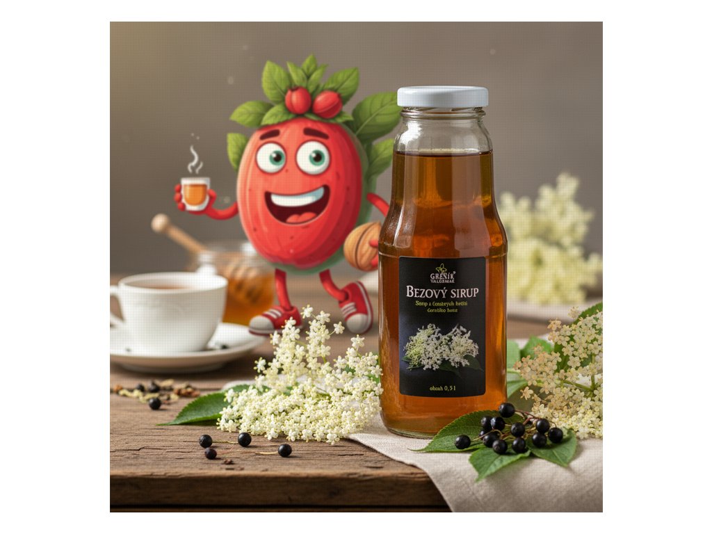 Sirup z čerstvých květů černého bezu, louhovaný za studena, k přípravě osvěžujícího nápoje.