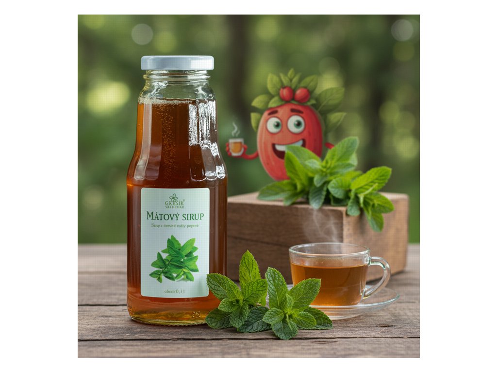 Sirup z čerstvé máty peprné, louhovaný za studena, k přípravě osvěžujícího nápoje.
