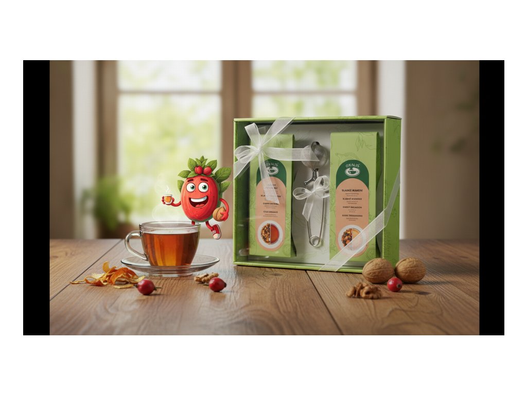 Oslaďte si život bez výčitek s těmito čaji. Dárkové balení obsahuje: Sladký pomeranč 50 g - sypaný aromatizovaný ovocný čaj bez ibišku, Sladké mámení 50 g - sypaný ovocný čaj aromatizovaný, kleště malé nerez sítko Ř 4,5 cm, kartonový obal.