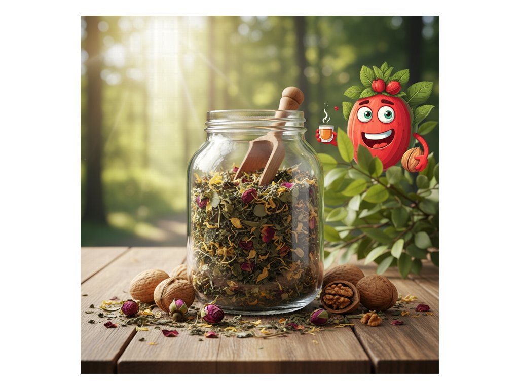 maliník list, kopřiva list, smetánka kořen, šípek, bříza bělokorá list, guarana, černý bez květ, květy růže a měsíčku. Výživové údaje na 100 ml: energetická hodnota 18 kJ/ 4 kcal, tuky 0 g (z toho nasycené mastné kyseliny 0 g), sacharidy 0 g (z toho cukry 0 g), bílkoviny 0 g, sůl 0.03 g.