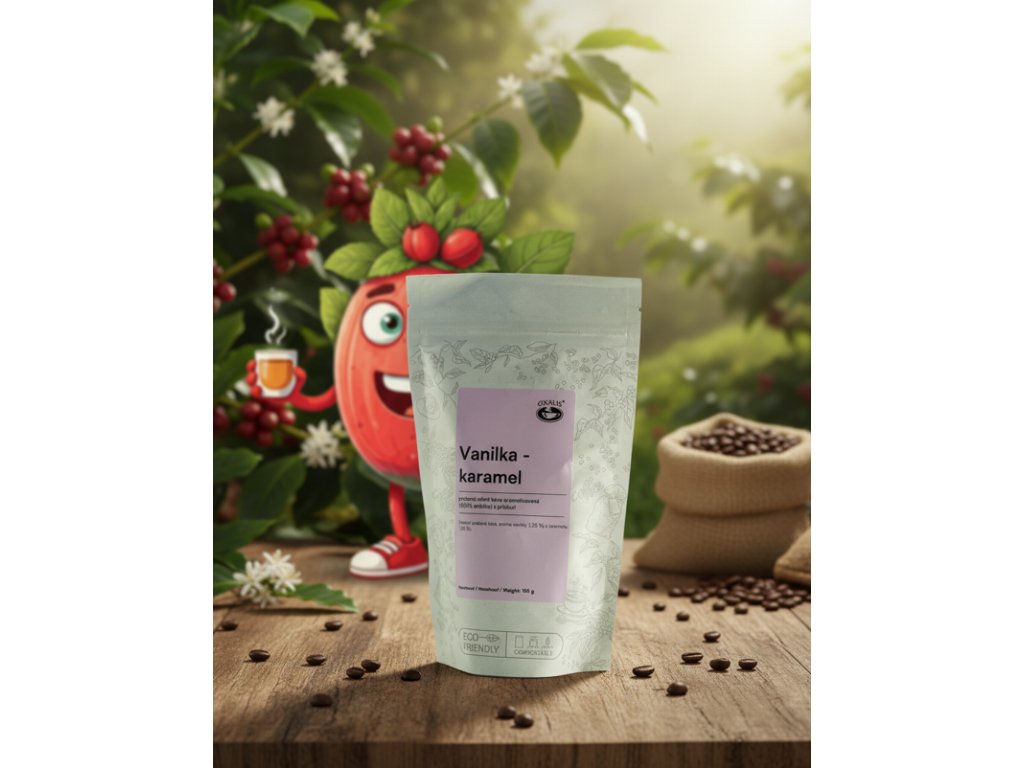 Pražená mletá káva aromatizovaná (100% arabika) s přírodním aroma vanilky a karamelu.