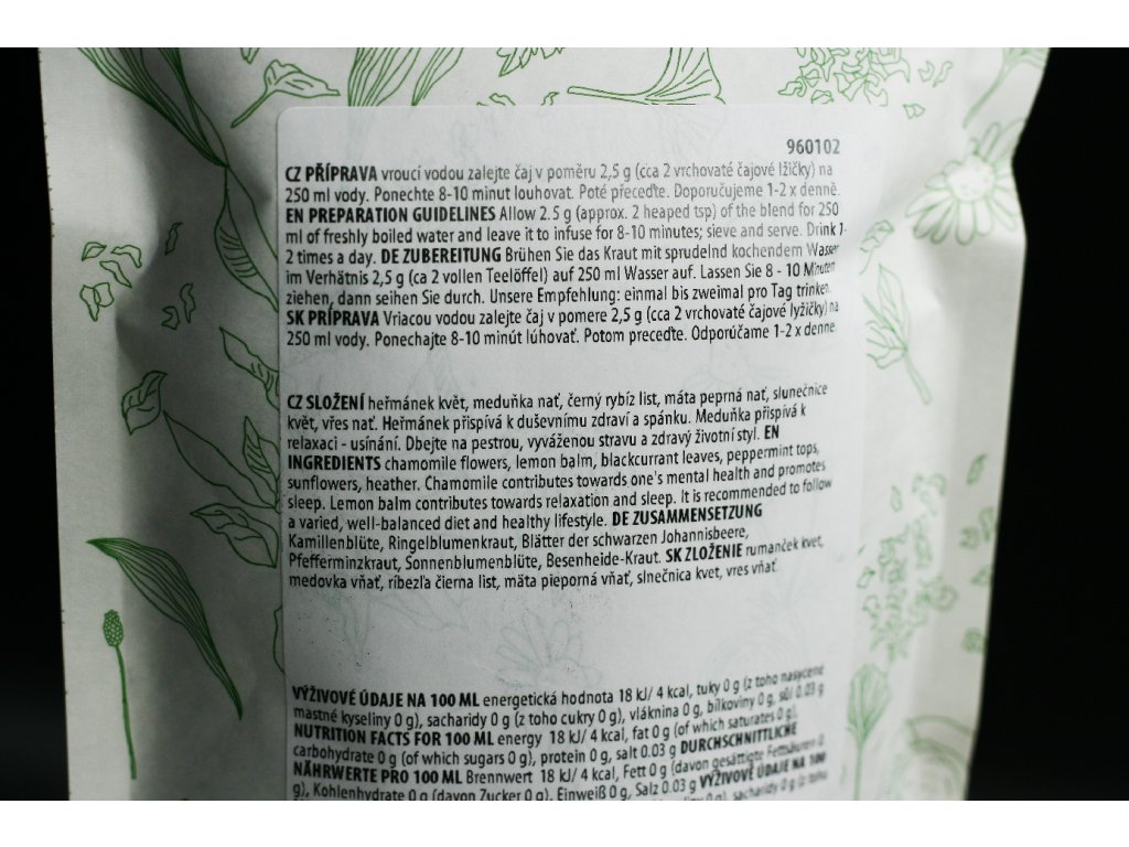 Heřmánek přispívá k duševnímu zdraví. Květy lípy přispívají ke spánku. Levandule přispívá k relaxaci a spánku. 500 g