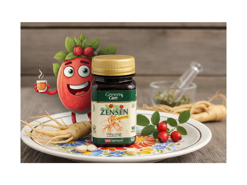 Ženšen 1000 mg - Ženšen pravý, latinsky Panax ginseng, někdy označovaný také jako všehoj ženšenový nebo ženšen korejský, je jedna z nejznámějších léčivých rostlin na světě. Široké využití ženšenu vychází z tradiční čínské medicíny, kde byl hojně využíván již od pradávna. Nejvyšší množství účinných látek obsahuje jeho kořen, který se využívá pro podporu duševního i fyzického zdraví, při dlouhodobé stresové zátěži nebo rekonvalescenci.